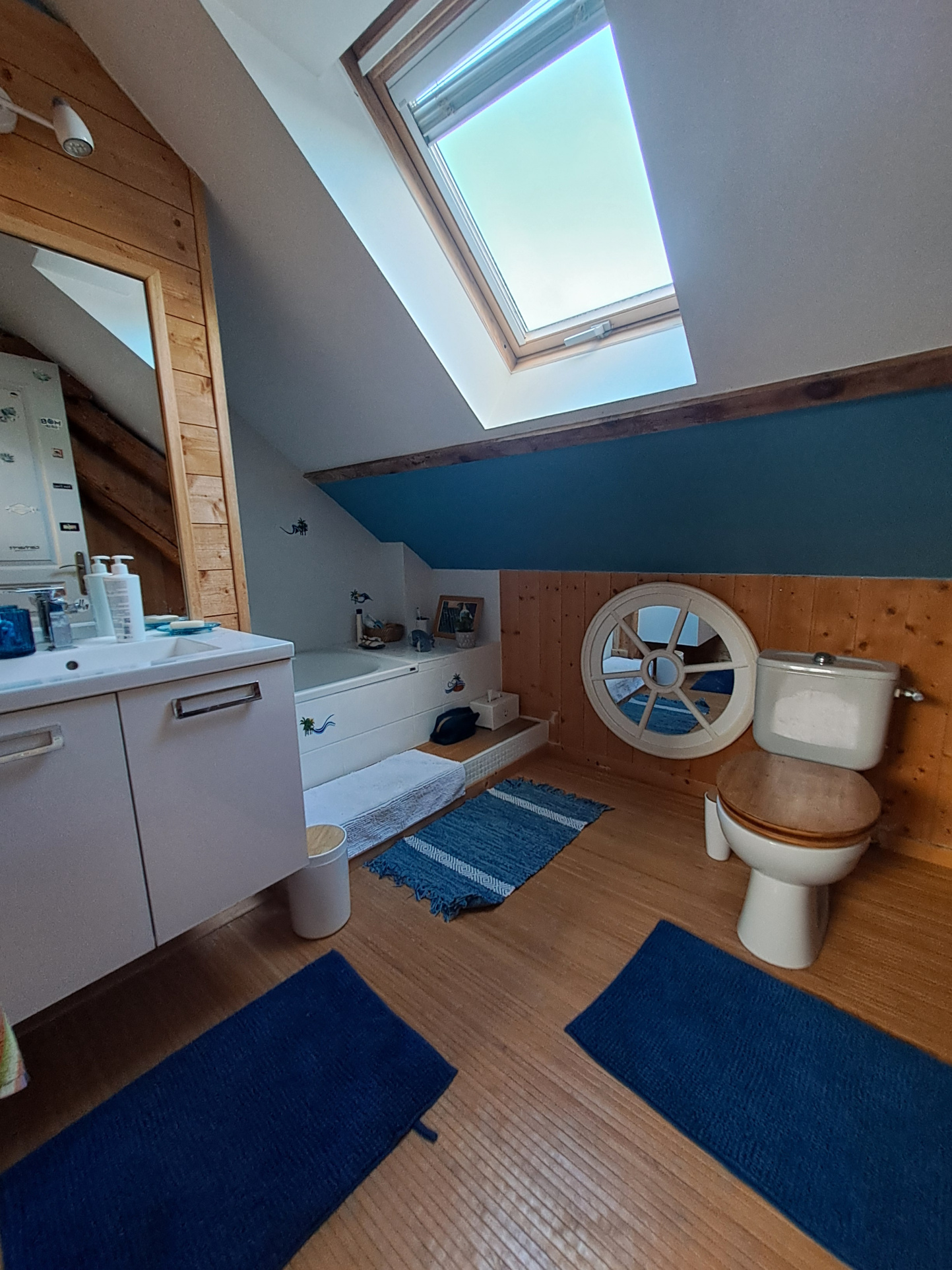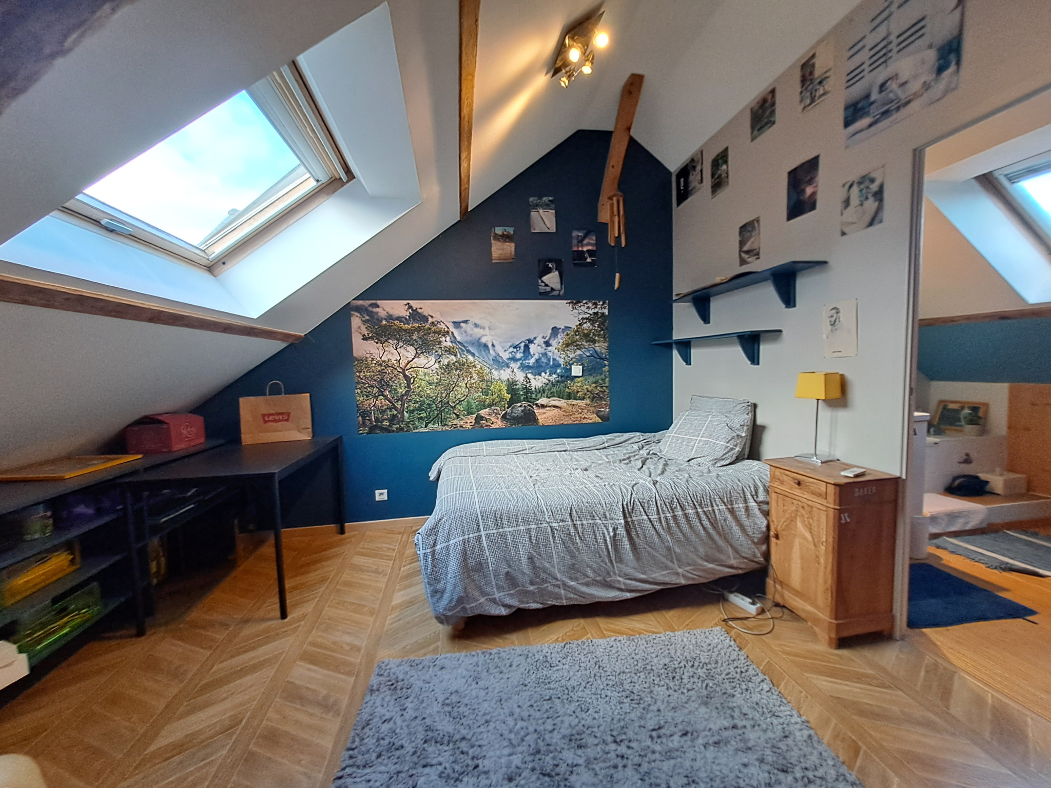 L’étage bénéficie d’une mezzanine idéale pour une salle de jeux avec un balcon surplombant le jardin, un palier menant à deux chambres, un bureau et une salle de bains avec WC.