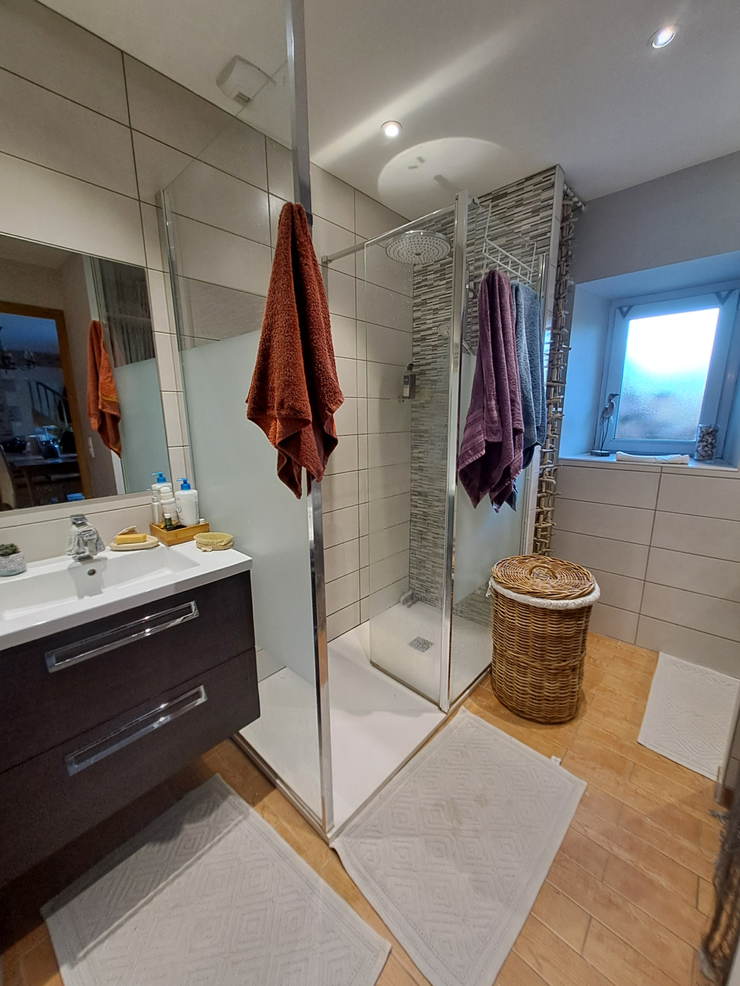 Le rez de chaussée offre une vaste pièce de vie dotée d’un poêle à granulés avec lumière traversante donnant sur un jardin cocooning au Sud à l’abri des regards et sur un second au Nord, une grande cuisine aménagée et équipée, une suite parentale de 16 m2 composée d’une chambre et de sa salle d’eau avec deux vasques et douche à l’italienne, WC indépendant.