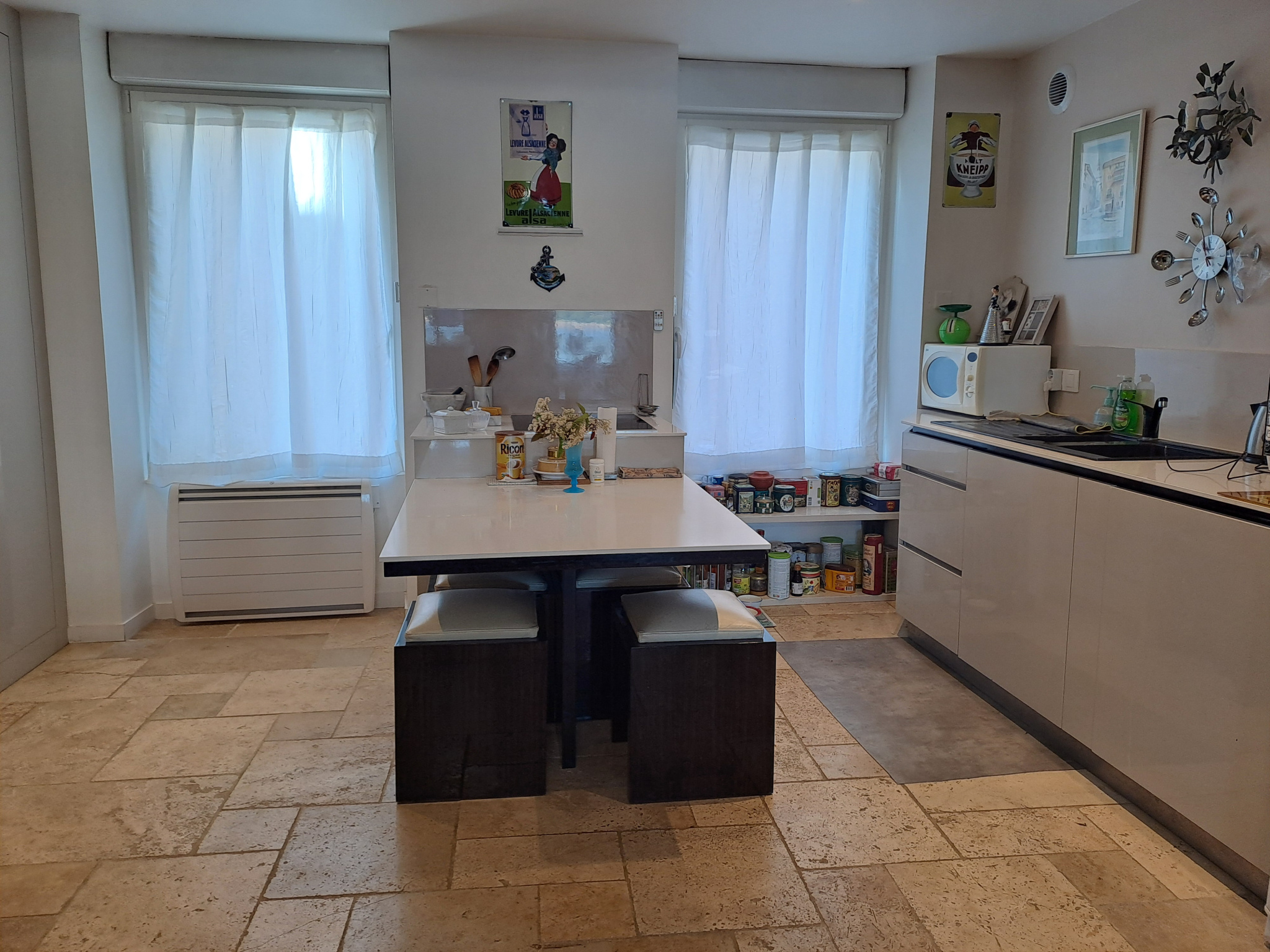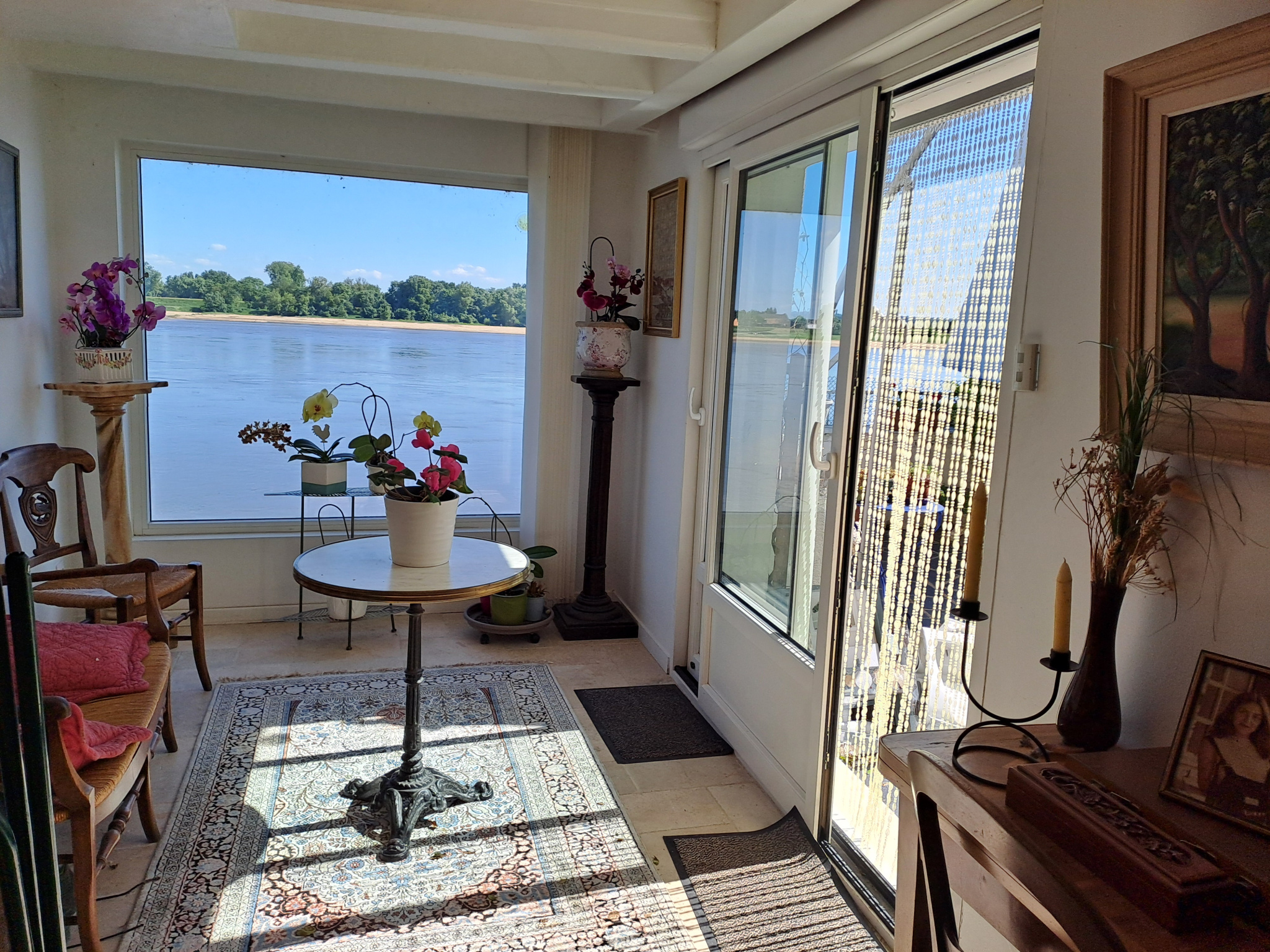 Elle offre une cuisine aménagée et équipée avec un ilôt central et est ouverte sur la pièce vie donnant sur la Loire et la terrasse. Laterrasse de 25 m2 surplmmobant la Loire est ensoleillée tout au long de la journée.
