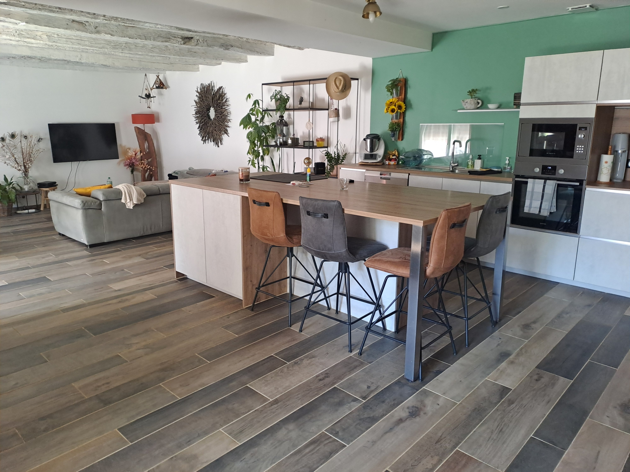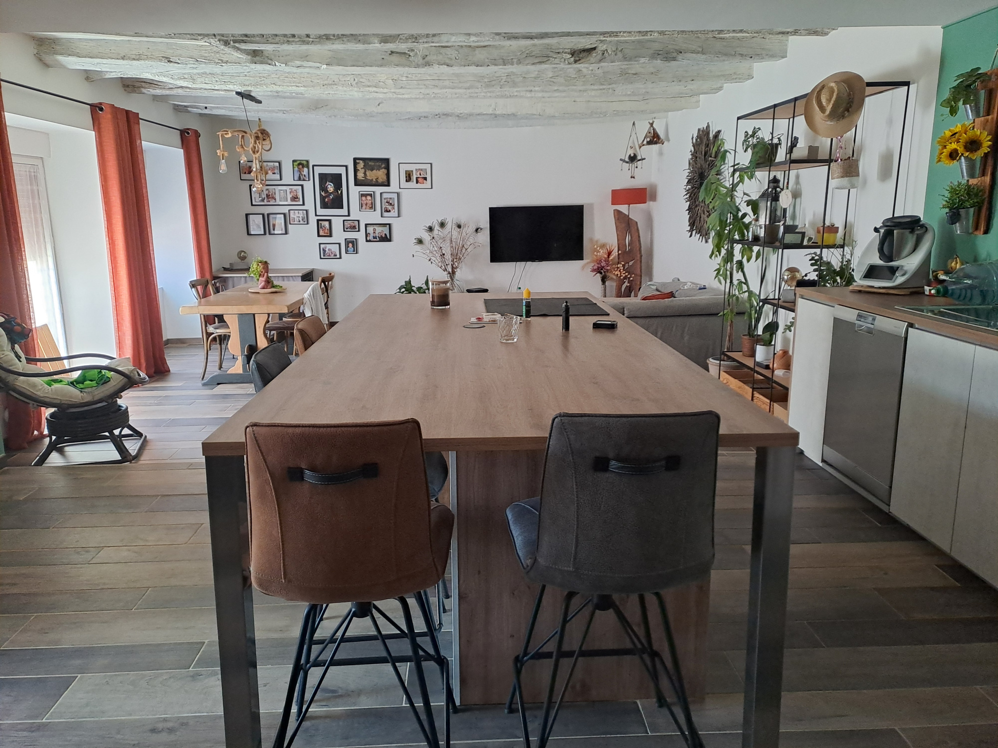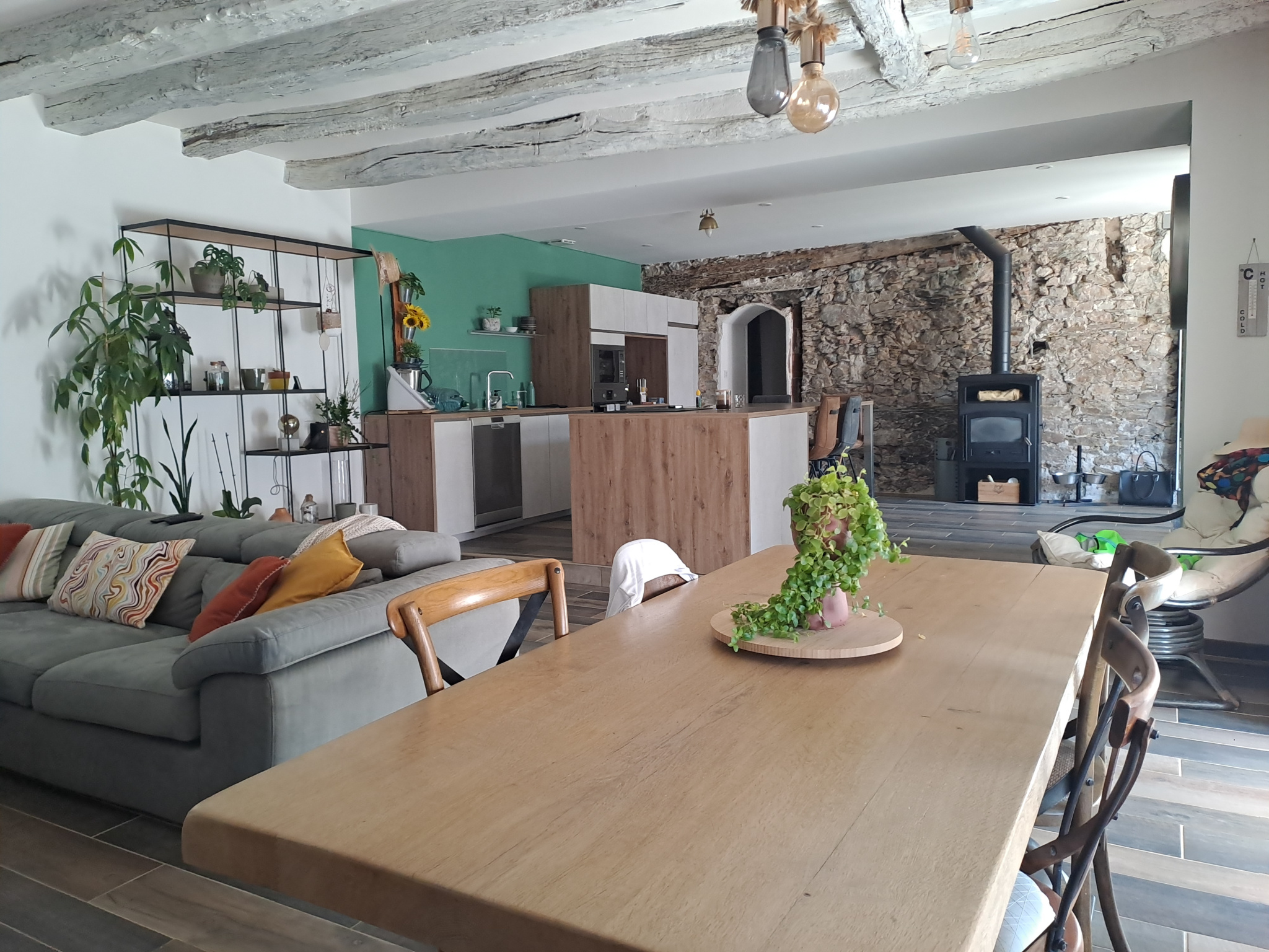 Elle offre au rez de chaussée une spacieuse cuisine aménagée et équipée de 2022 ouverte sur la pièce de vie avec ses poutres authentiques et son poêle à bois. La partie nuit dispose de deux chambres dont une parentale de 25 m2, une salle de bains avec baignoire et douche, WC, et un espace buanderie.