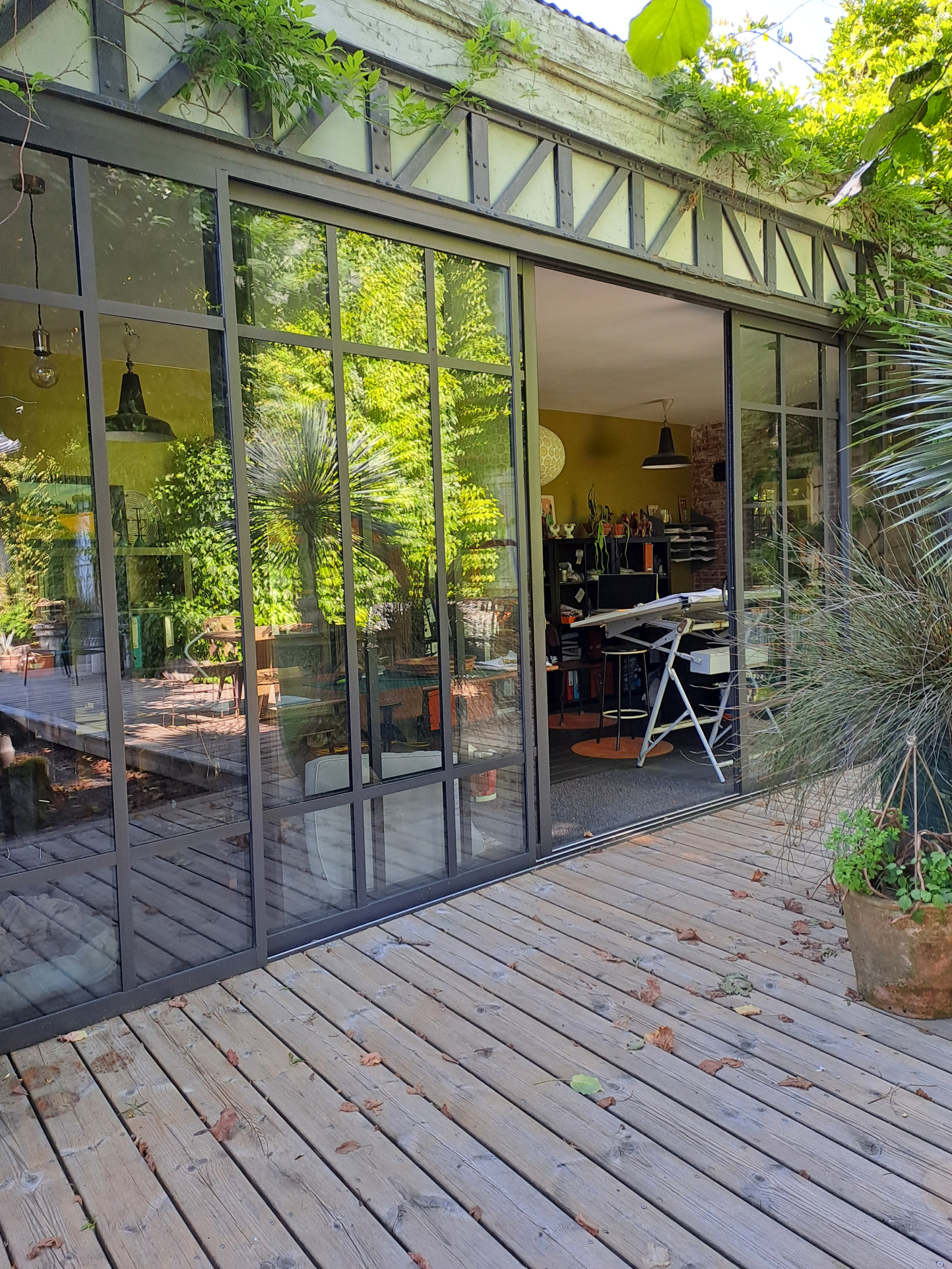 Cette bâtisse accueille une habitation principale d’environ 210 m2 offrant un vaste salon avec son poêle à bois, une pièce de vie donnant sur la cuisine aménagée et équipée, un bureau – atelier avec verrière ouvrant sur la terrasse, une buanderie, WC.