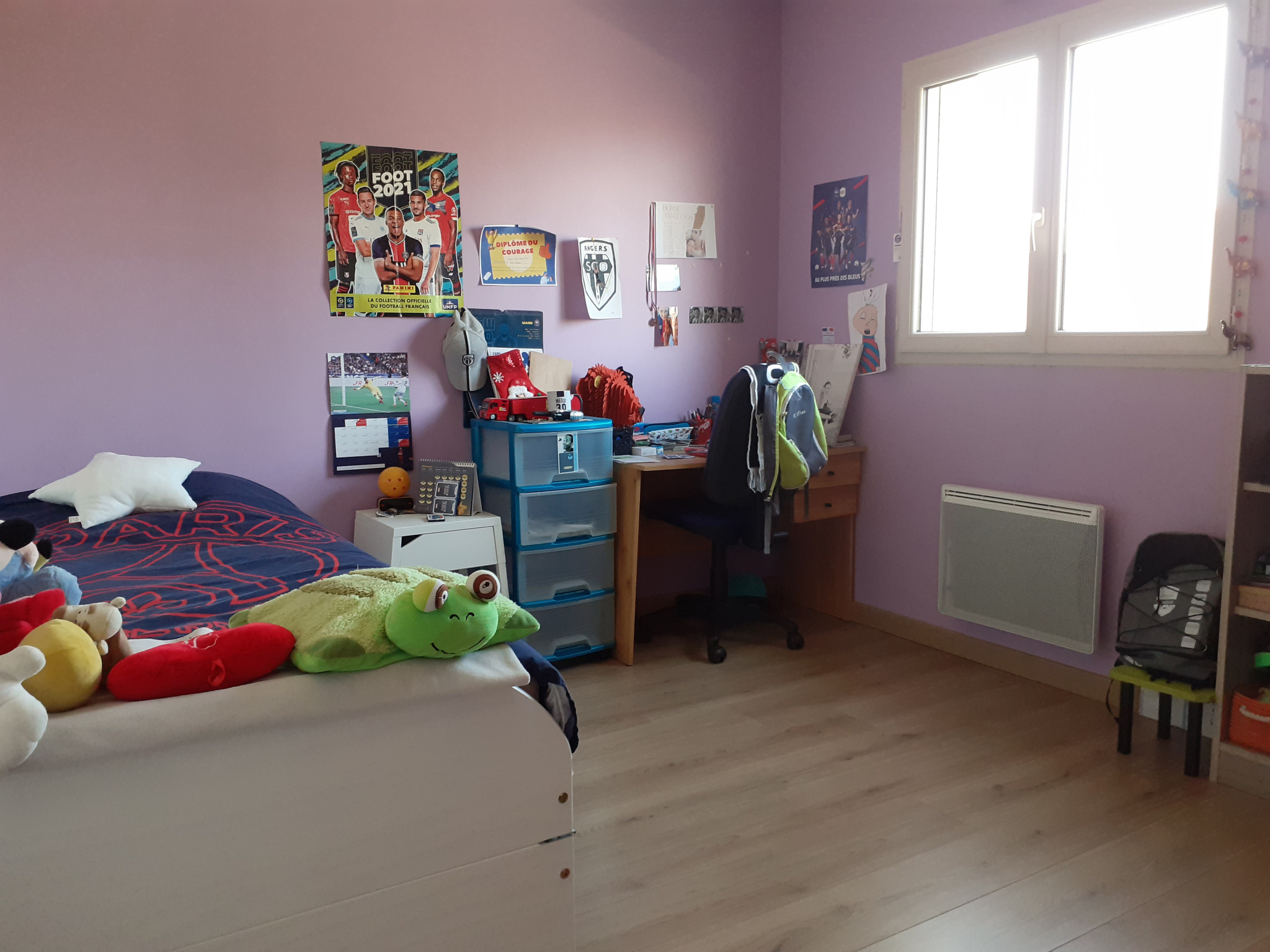A l’étage, un palier dessert trois chambres avec chacune leur placard et une grande salle de jeux, salle d’eau avec WC et placard.