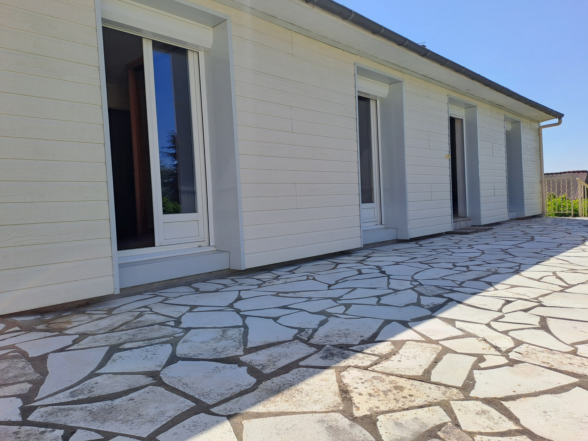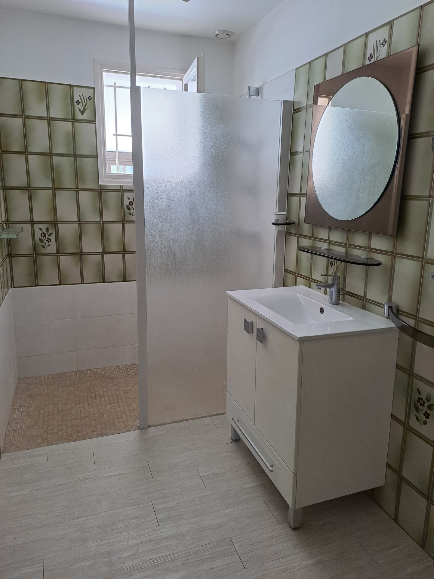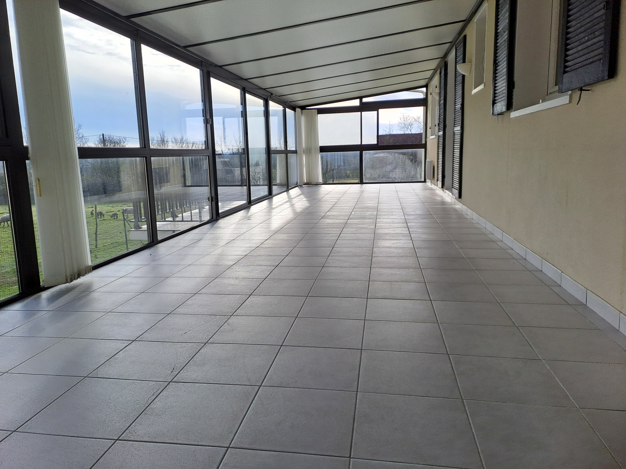 Elle offre une entrée avec placard, une cuisine aménagée ouverte sur la pièce de vie avec cheminée, une véranda de 40m2, un couloir donnant accès à trois chambres et un bureau donnant sur la terrasse, salle d’eau avec douche à l’italienne, WC indépendant.