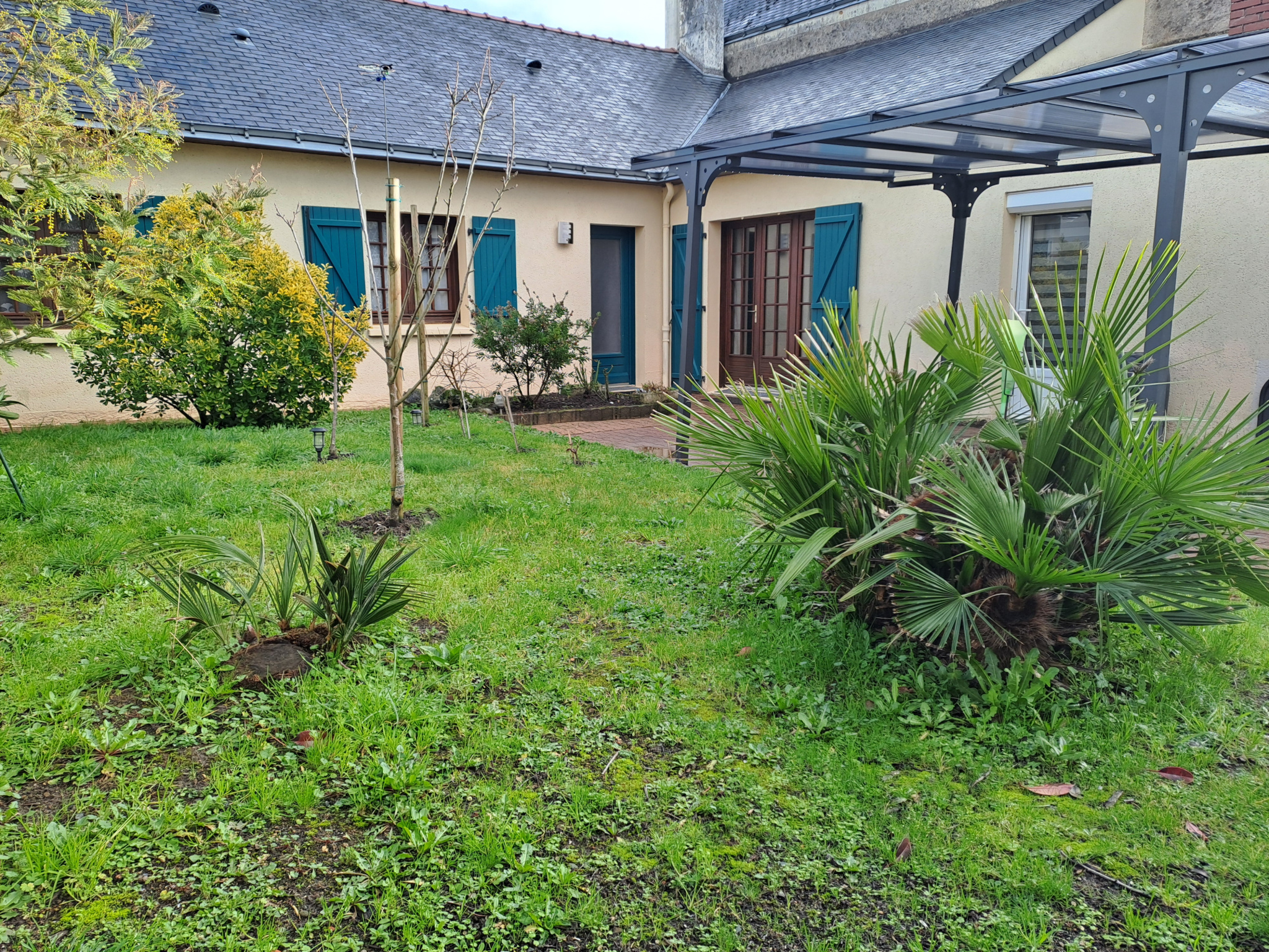 Jardin clos de murs avec terrasse et carport.