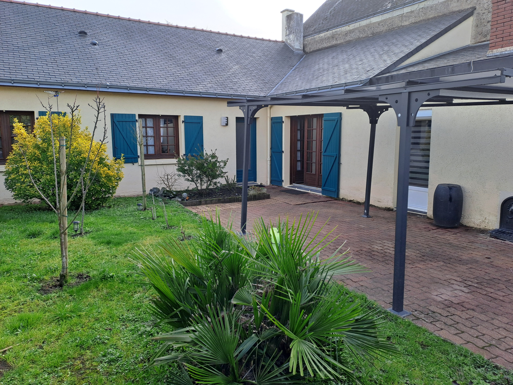 Jardin clos de murs avec terrasse et carport.